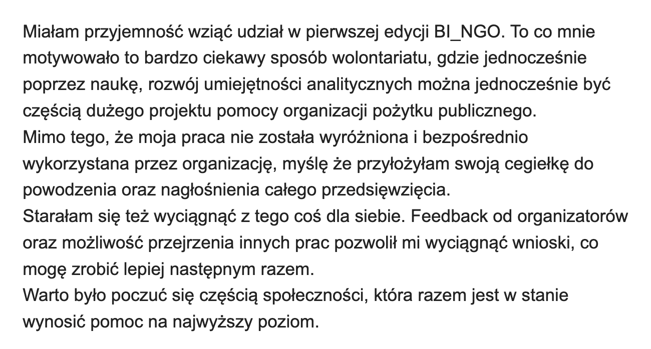 Zajrzyj na stronę https://jezykdanych.pl/bi-ngo-1/ i zobacz prace kilkunastu wyróżnionych wolontariuszy z I edycji.